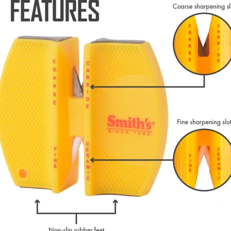 - 2-STAGE – Smith’s 2-Step Pull-Through Sharpener has two stages of sharpening. coarse and fine.