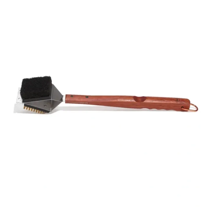 The accustomed griller will be primed to barbecue after cleaning with this traditional and dependable 3-in-1 grill brush. Apart of an extended family of tools. this essential tool is down to earth and projects attractive aesthetic features. The oversized head and ergonomic rosewood handle provides optimal comfort and control so you can attack the dirtiest of grills. This brush has all you need: durable brass bristles that are safe for all grill surfaces. a scrub pad. and a scraper for those tough. stuck-on messes. The convenient copper loop at the base of the handle allows for easy storage when not in use. This tool’s traditional and down to earth feel makes it a natural fit for the griller at heart.