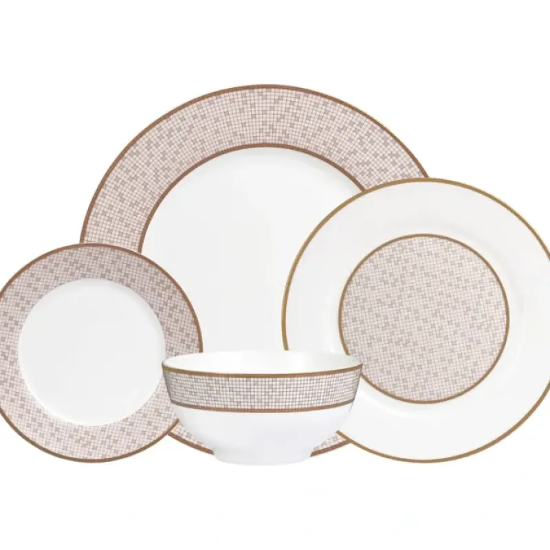 Endowed with antiquated golden bands and distinctively designed with a mosaic tile pattern. the dinnerware set promises opulence. A timeless blend of luxury and sophistication. this dinnerware set is the perfect way to bring a hint of magnificence into your dining experience.|Semi-Handmade|Imported|Material: Bone China|Color: White. Off White. Grey. Antique Gold