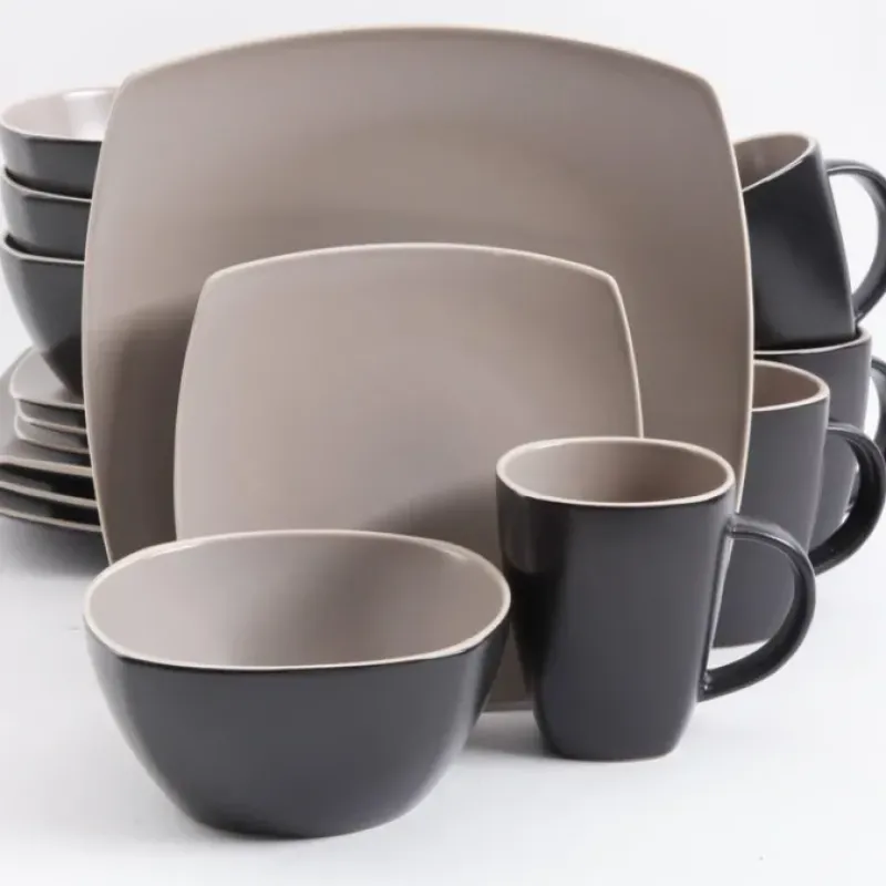 WHAT’S IN THE BOX: Service for 4 that includes 4 of each of the following: 11” Dinner Plates. 7.5” Dessert Plates. 6” (31 OZ) Cereal Bowls and 12 OZ MugsCARE INSTRUCTIONS: beautiful matte taupe and black dishes that are also dishwasher and microwave safeSTONEWARE/MATTE GLAZE: a smooth. flat finish dipped in beautiful solid color creates a sleek and artistic addition to the table. The high firing temperature. thick build. and mix of all-natural clays. makes stoneware an incredibly durable material.CONTEMPORARY DESIGN: artisanal stoneware featuring exposed white rims and an organic square shape with a matte finish.PERFECT FOR GIFTING: beautiful colors. trend forward design. and the ability to mix and match sets makes this collection the perfect gift and holiday present for your friends and relatives. This collection is particularly popular as a wedding gift for couples moving into a new home together.