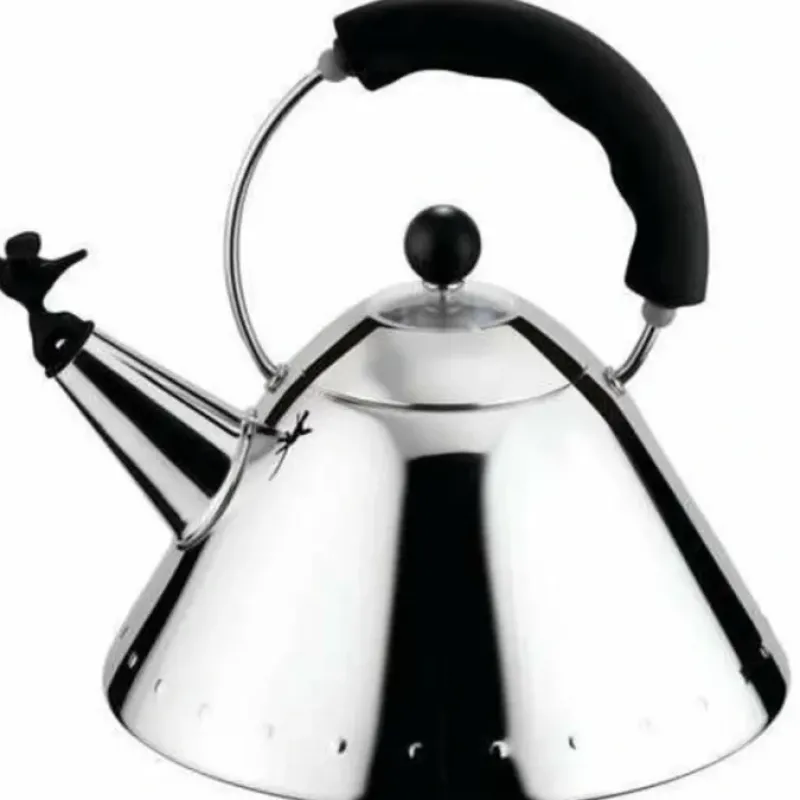 This stainless steel tea kettle features a mirrored finish. bird-shaped whistle. and a magnetic steel bottom that’s suitable for induction cooktops.