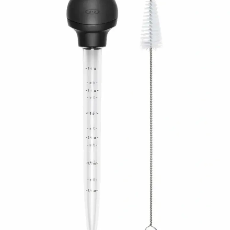 The OXO SoftWorks Turkey Baster features a non-slip bulb and collar that can be gripped several different ways for a safe and easy basting experience. The flat bulb design prevents rolling when placed on the counter. while the basting tube is crack resistant and high-heat safe.