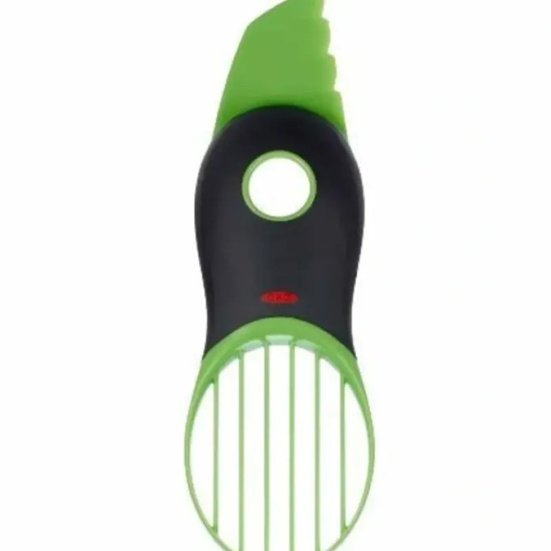 Split. pit. slice and scoop avocados safely and effectively with the OXO SoftWorks 3-in-1 Avocado Slicer. The blade easily cuts avocados to their core without being sharp to the touch. and the stainless steel pitting tool removes the pit with one quick twist. Use the fan blade to slice the ripe. delicious fruit into seven perfect pieces. Green body. Top-rack dishwasher safe.