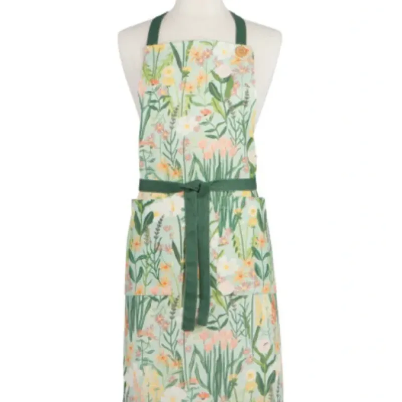 A soft cotton apron is paired with extra long waist ties and a wooden button closure for function and charm.