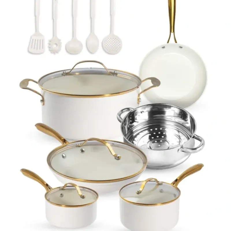 Gotham Steel Natural Collection Cream/Gold Handles 15 Piece Cookware Set.Gotham steel natural collection: healthier cooking is easy with this nonstick ceramic cookware set. Pots and pans are designed to be 2x more durable. dishwasher safe. and oven safe up to 500f. Gold stay-cool handles allow you to go from stovetop to oven. But this set doesn’t just cook good. they look good too. with a modern cream color that adds an elevated aesthetic to your kitchen.15 Piece kitchen cookware set: this set includes everything you need to outfit a kitchen including an 8.5 Inch frying pan. 10.25 Inch frying pan with lid. 1.5Qt saucepan with lid. 2.5Qt saucepan with lid. 5qt stockpot with lid and steamer. 5 pc nylon kitchen utensils set.Ultra nonstick ceramic surface: healthy cooking is just a step away. Thanks to a nonstick surface that’s 2x more durable than previous generations. minimal to no oil or butter is needed. And they’re designed to properly conduct heat so food cooks evenly.