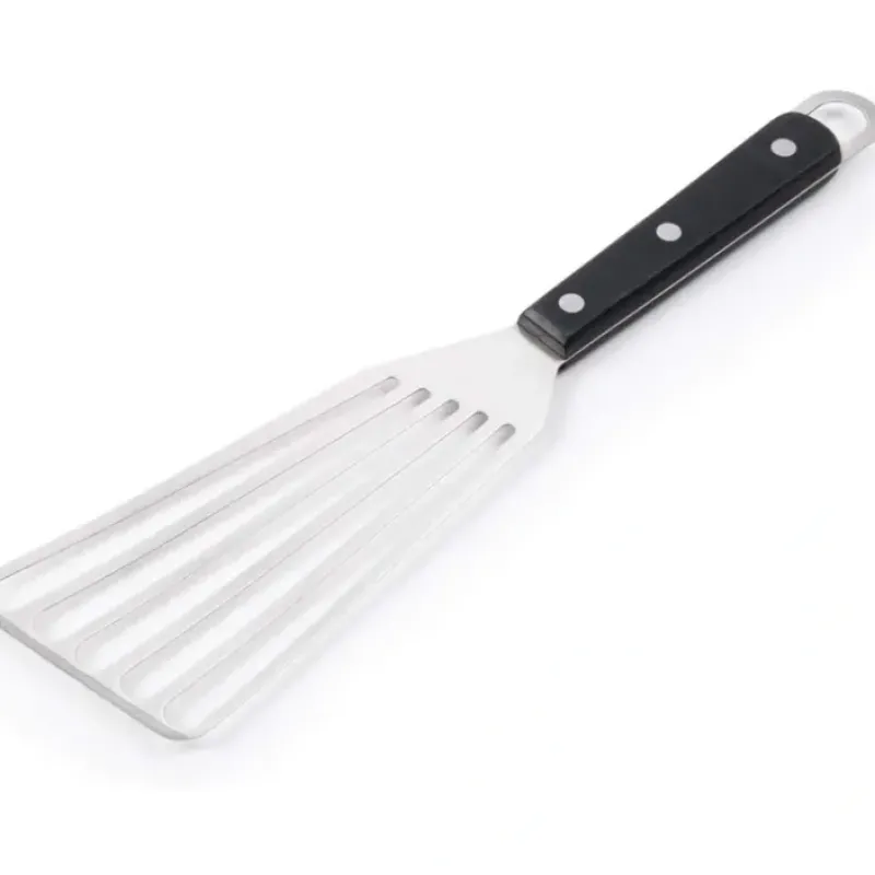 You need a tool that can handle even your most delicate dishes. The Chef’s Slotted Turner from Fox Run is lightweight and razor-thin. specially designed to flip delicate foods and keep them intact. Great for flipping eggs. fish. and crepes. while still being strong enough to lift heavier foods. The turner features a full tang. polished stainless steel construction with three silver rivets to secure the heat and water resistant POM handle. which combines the feel of wood with the easy care of plastic. The 3 x 6 inch head features wide slots to drain liquids when cooking vegetables. scrambled eggs. and more. Upgrade your spatula to the Chef’s Turner today.