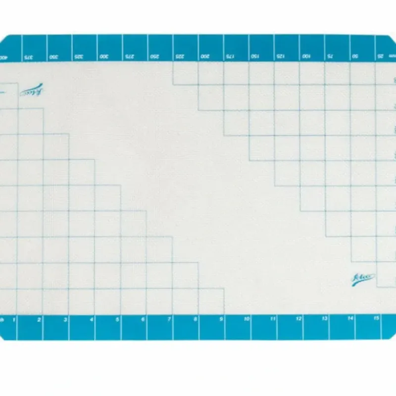 This FDA approved mat is made of fiberglass surrounded in 100% food grade silicone. When placed on any half-size sheet pan. it provides even heat transfer for your cookies and other baked treats. It has a naturally non-stick surface that provides an excellent release and makes cleanup a breeze! For easy size reference. this mat features pre-printed measurement markings and grids in both inches and centimeters. The grid markings help when rolling out precise portions of dough or when determining the proper size of fondant to cover your cake. After each use. simply wipe down the mat with a wet cloth and let it air dry. Loosely roll the silicone mat and do not fold. bend. or scrape it. Do not use this mat for cutting ingredients with a knife.