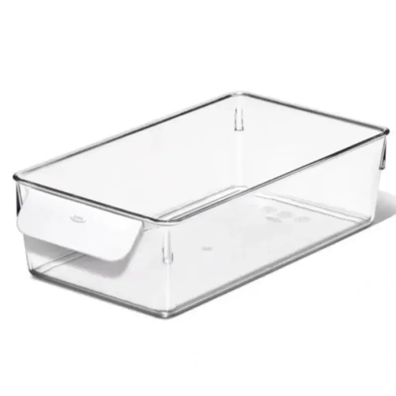Organize the contents of your fridge to cut down on clutter and prevent food waster. The OXO Good Grips Fridge-Focused Organization System features a combination of bins. drawers. shelves. and risers. to help streamline your refrigerator. The clear. space-saving Bin design provides a visually pleasing way to keep food from getting lost and helps prevent food waste. The rounded handles provide a comfortable grip. especially helpful while prepping a recipe or for little hands grabbing a snack. A smooth base allows the Bins to glide easily so you can keep an eye on food expiration dates. Also available in 8 in x 10 in; 8 in x 14 in and 5 in x 14 in.