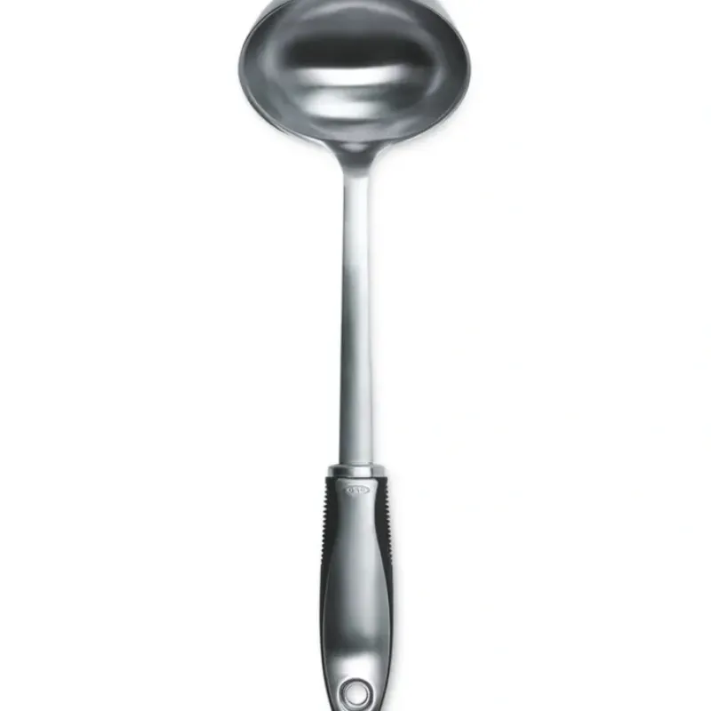With its 4-inch-diameter bowl and gently curving handle. this sturdy ladle eases the task of portioning out soups. broths. chili. beans. and stews. Measuring 13 inches long. it reaches to the bottom of nearly any pot. Oxo’s Steel line is an all-stainless-steel variant of the company’s familiar fat-handled Good Grips line. Rather than being straight-sided. this tool’s handle is tapered from heel to finger grip and has satin-finish. stainless-steel panels top and bottom. The handle’s sides feature the same design as those in the Good Grips line–they’re made of soft processed rubber for comfort. with “fins.” or grooves. that flex under pressure. conforming to individual finger grips and providing control when handles are wet or slippery. Like all Oxo tools. this ladle is dishwasher-safe; a hole in its handle facilitates hanging on a hook or peg.