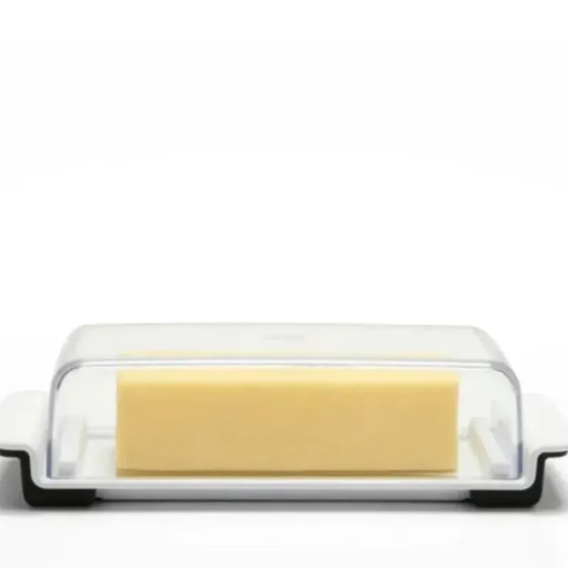 Our Butter Dish has stoppers on three sides to keep sticks from sliding around as you cut them. Accommodates longer. slimmer sticks (the dominant shape east of the Rocky Mountains) as well as shorter. stouter sticks (commonly found out West). with measurement markings for each.