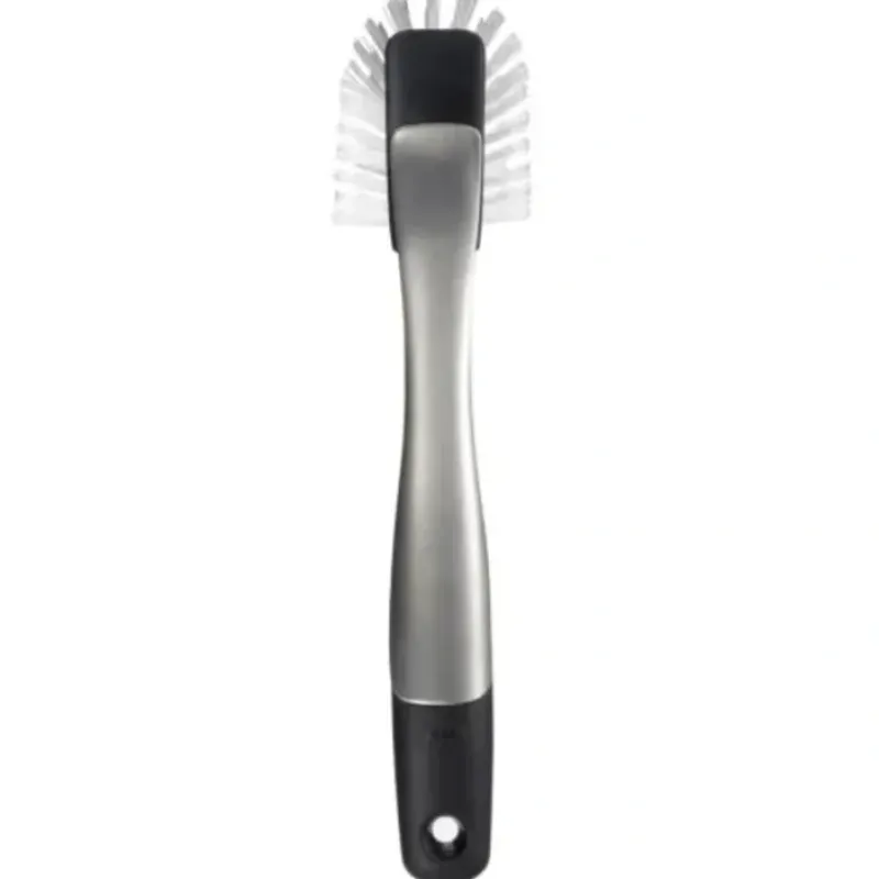 Our SteeL Dish Brush features durable. nylon bristles and built-in scraper. Both are safe for non-stick cookware and help remove baked-on food. Brushed stainless steel body adds a touch of elegance. Soft. non-slip handle provides a secure grip. even when wet. Dishwasher safe.