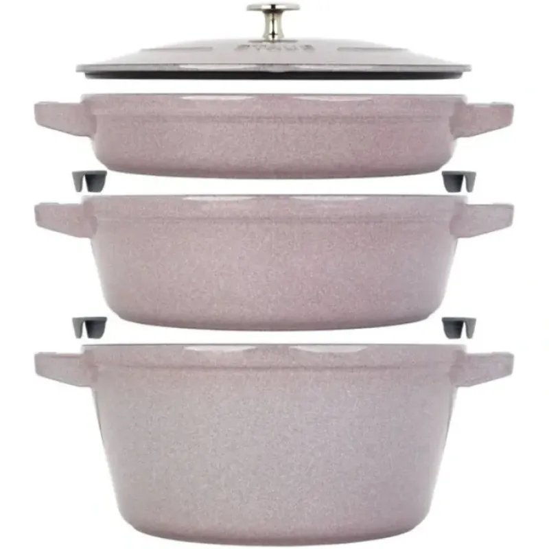 Like all STAUB cast iron. the Stackable set is unsurpassed for slow-cooking meats and vegetables to tender perfection. and for simmering hearty stews and soups. Cast iron possesses exceptional heat-retaining qualities. so the pot heats evenly throughout. With a heavy weight. tight-fitting lid that retains moisture and tiny spikes on the lid interior that create a rain-forest effect evenly returning juices back onto food. you can expect moist. perfectly cooked food every time you use these pans.