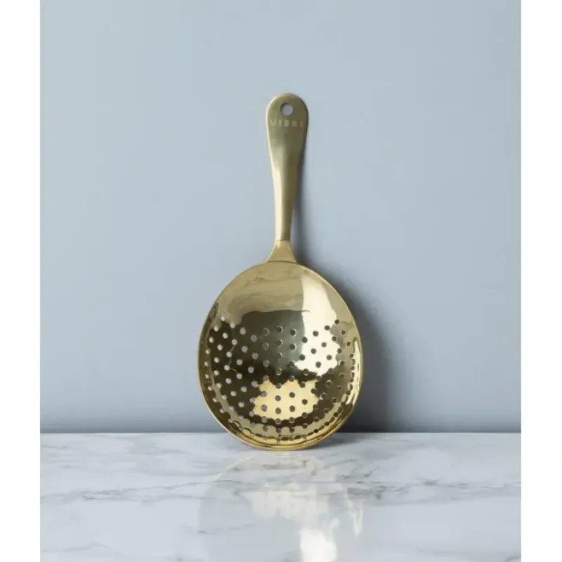 A bar essential as iconic as its eponymous drink. our professional-grade julep strainer is intrinsic to any finished bar set. Cast in stainless steel with a glittering gold finish. this tool features uniform perforation across a bowl perfectly sized to fit standard and large mixing glasses.