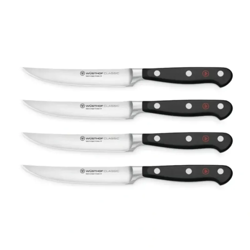 The iconic WSTHOF Classic Steak Knife is. like anything and everything WSTHOF. forged in a centuries-old global destination for knife artisanship: Solingen. Germany. The extra-sharp blade cuts perfectly through your favorite meat and vegetable dishes and compliments any table setting beautifully. Each Classic steak knife is forged from a single piece of specially tempered. high-carbon steel and precision-sharpened to stay sharp for longer. The elegant handle is triple riveted and equipped with a full tang for superior safety and durability.The WSTHOF Classic 4-piece Steak Knife set includes four (4)4 1/2″Classicsteak knives in your choice of color.
