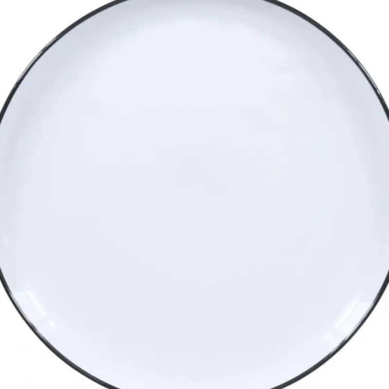 - Crisp. glossy white color with a thin black ring forming a silhouette around the rim