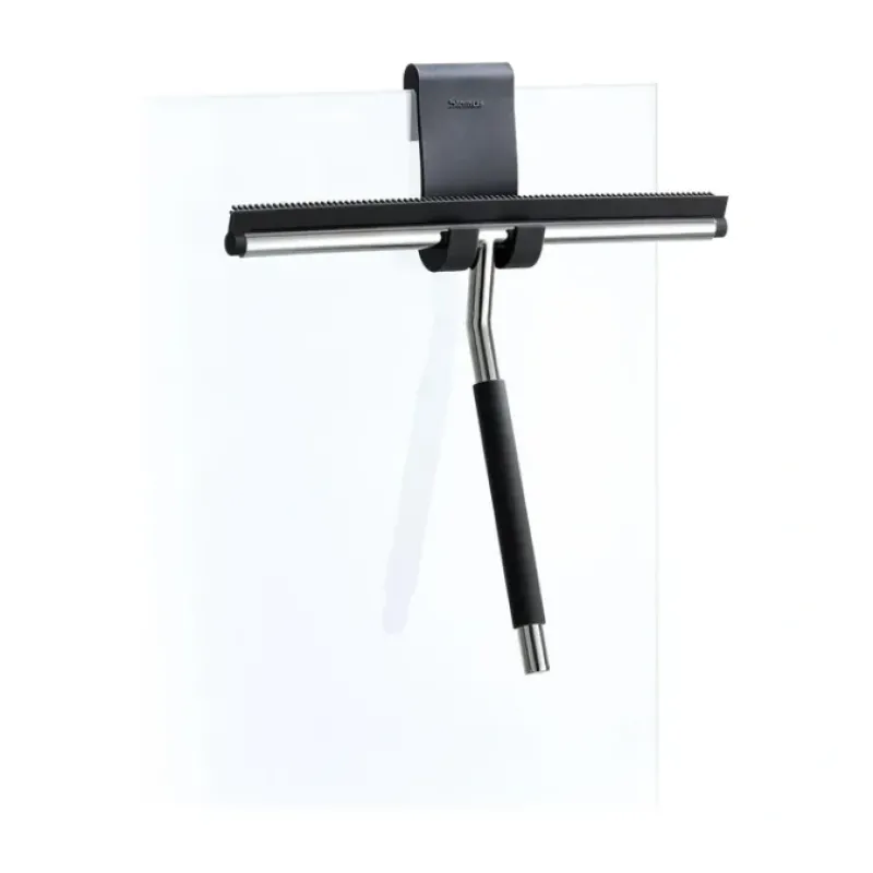 The Blomus shower squeegee with hanger features a 2 sided silicone blade. One side features a straight edge for a streak free surface and the other is corrugated for cleaning.
