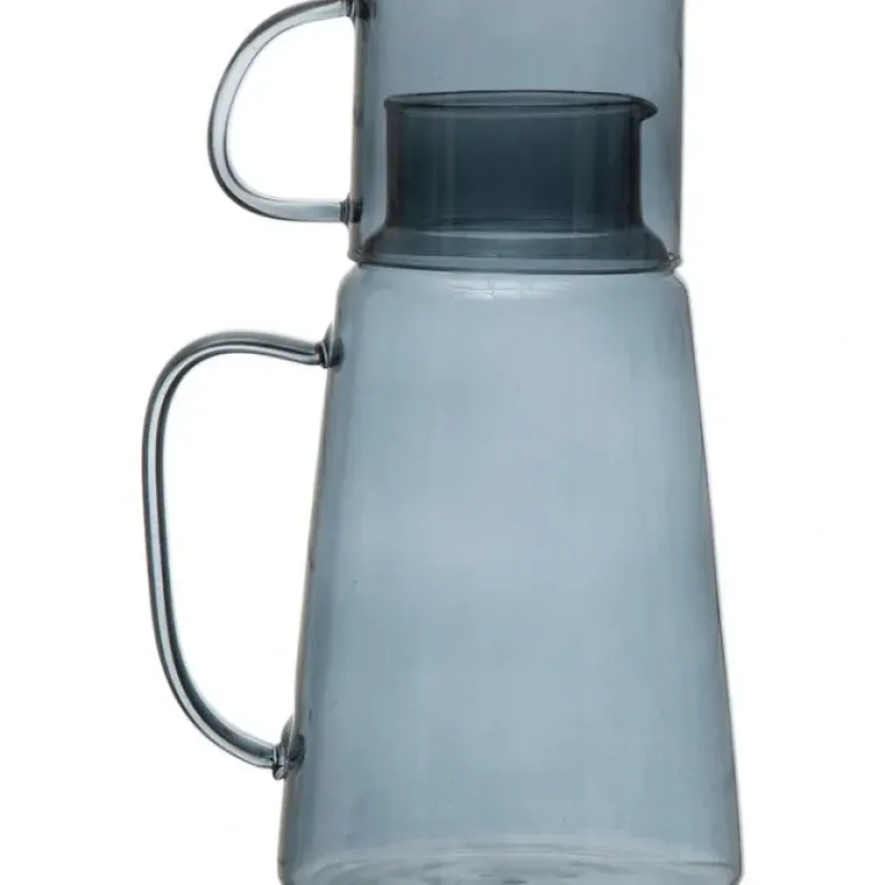 This delightful glass carafe with mug comes in a charming set of two. This set is a pleasing and useful accent for a bedroom. bathroom. or kitchen and complements a wide range of styles.