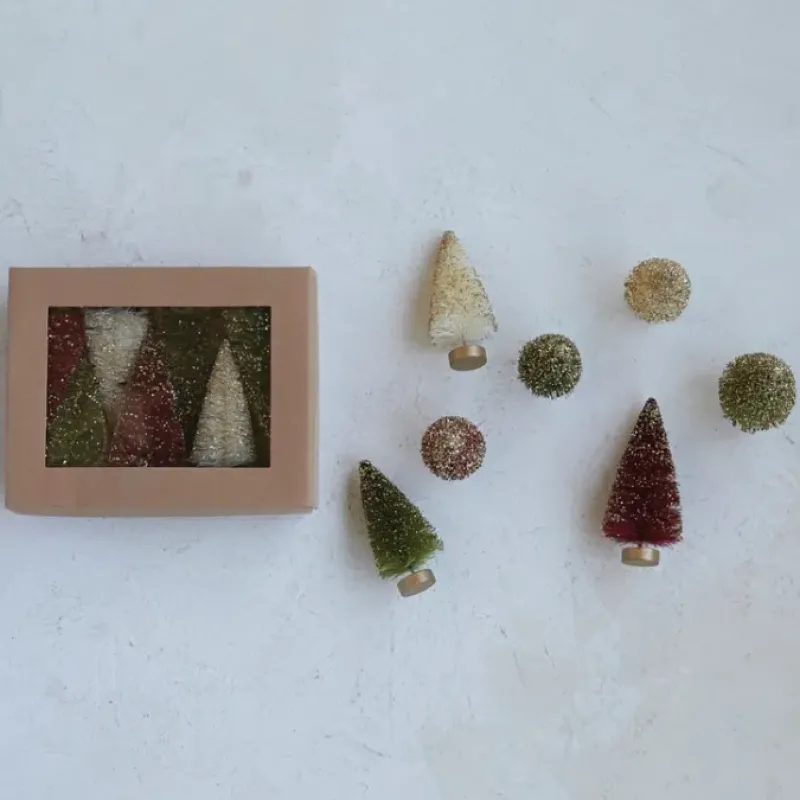 3-3/4″H – 4-1/2″H Sisal Bottle Brush Trees w/ Gold Finish Wood Bases Glitter. 3 Colors. Boxed Set of 7