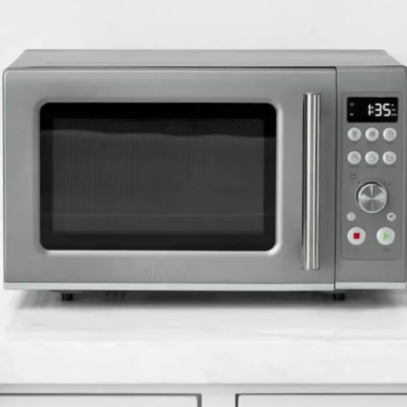 While compact in size. this microwave is big on convenience. Easy shortcuts and a food menu take the guesswork out of cooking. making it simple to defrost or cook your favorite foods with the push of a button. A soft-close door. Breville sound suite and mute button significantly reduce noise. while a child lock option promotes safety.