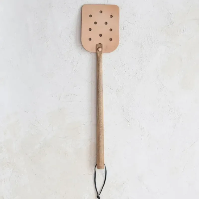 - This contemporary. buffalo leather fly swatter showcases a solid wood handle and attached tie