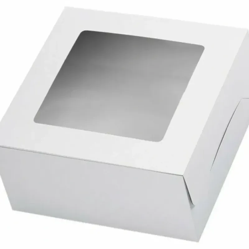 - Sturdy square box with a see-through window on top for holding and transporting a round cake