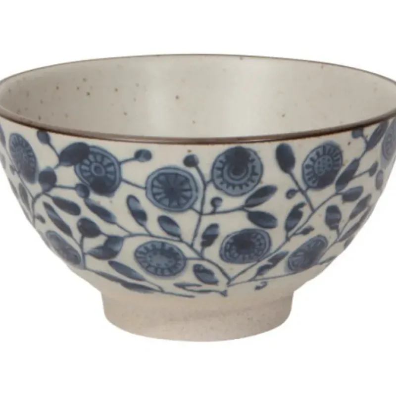 A natural background allows the blue patterns to move across the surface of these bowls and mugs. harmonizing them into one collection.