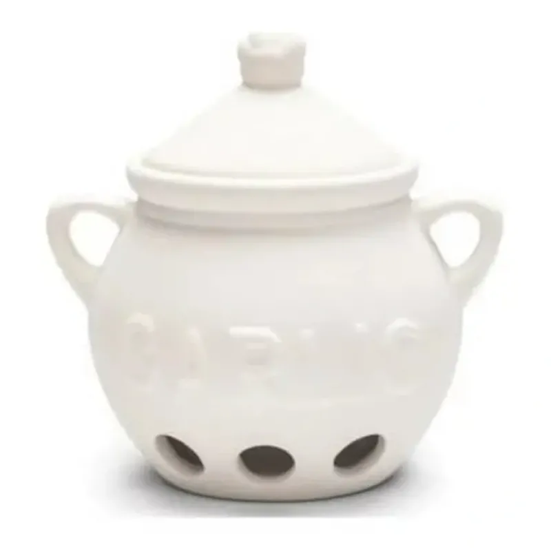 More times than not. some fresh garlic is just what you need to liven up a dish. Perfect for storing your go-to flavor enhancers. this Garlic Keeper is crafted of attractive white ceramic stoneware with a fitting garlic-shaped handle. This nonporous. unglazed stoneware with vent holes promotes proper airflow to preserve garlic cool and dry. and the lid protects from light for a longer shelf life. The jar won’t absorb moisture or odors! Add the mouthwatering taste of fresh garlic to your soups. sides. sauces. pizzas. toppings and more. An essential for all garlic lovers!