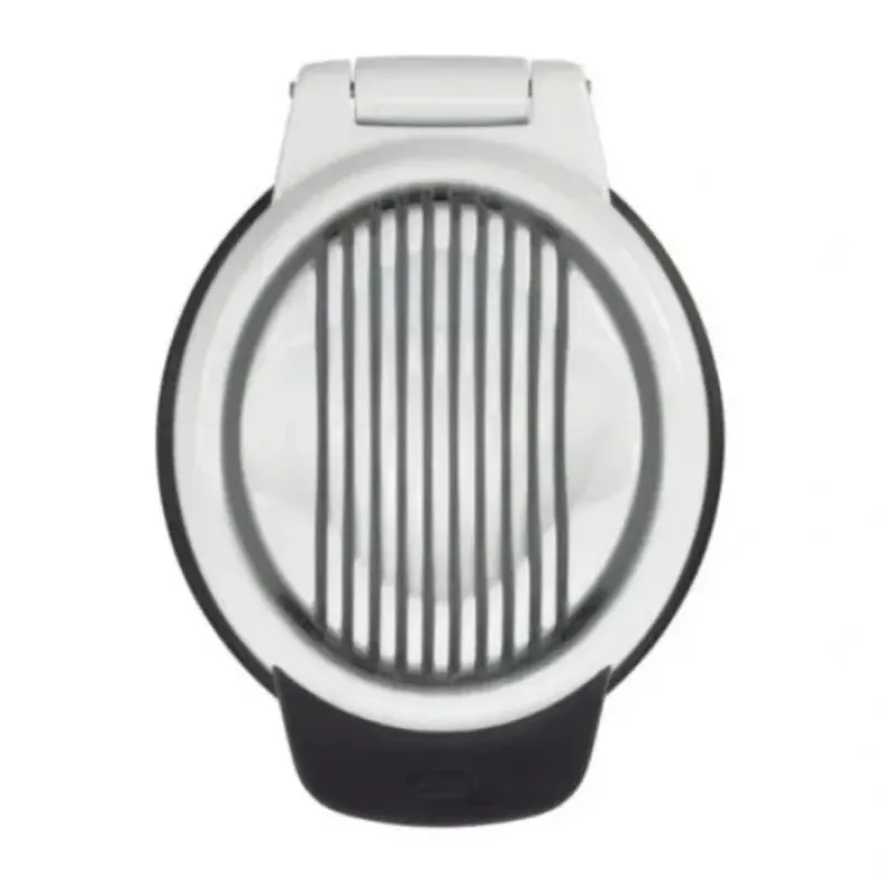 The OXO Good Grips Egg Slicer yields perfect 5 mm slices with one simple press. The holder cradles the egg in two directions. giving you the option of round or oblong slices. The raised handle is easy to open and close. and the non-slip base provides a comfortable grip while slicing over bowls or plates.