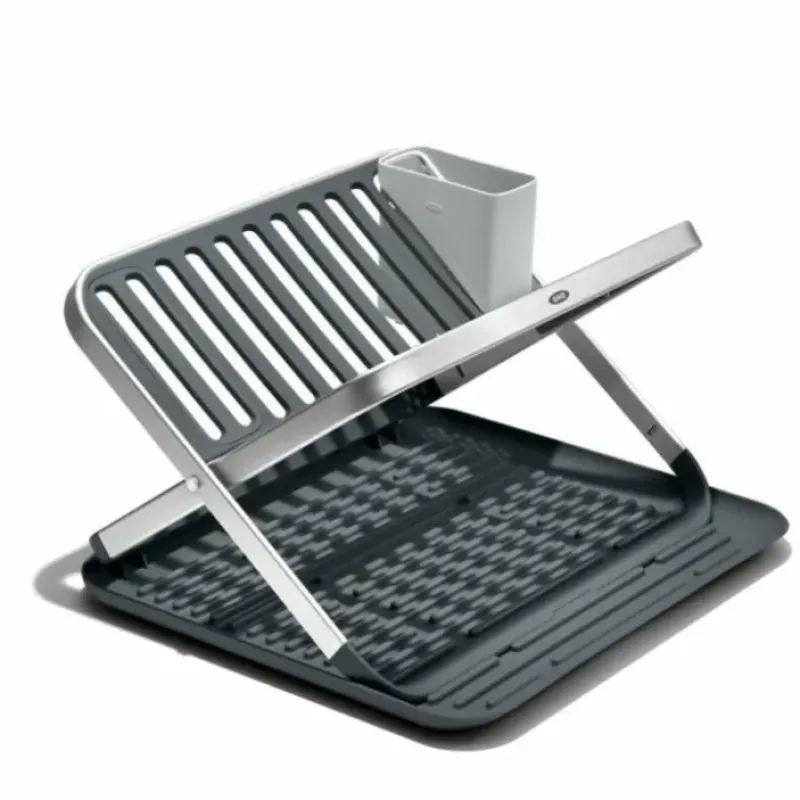 The OXO Good Grips Aluminum Fold Flat Dish Rack is the flexible solution for doing dishes by hand. The rustproof aluminum frame has a two-layer design that holds items of all sizes. and it’s customizable with a removable utensil cup that can be placed on either side of the Rack. It folds completely flat. making it ideal for use as a drying board for smaller loads as well as compact for easy storage. The built-in drain board features raised ridges that elevate items away from water for quick. efficient drying. and non-slip feet help keep the Rack stable on countertops. The clean design complements any kitchen.