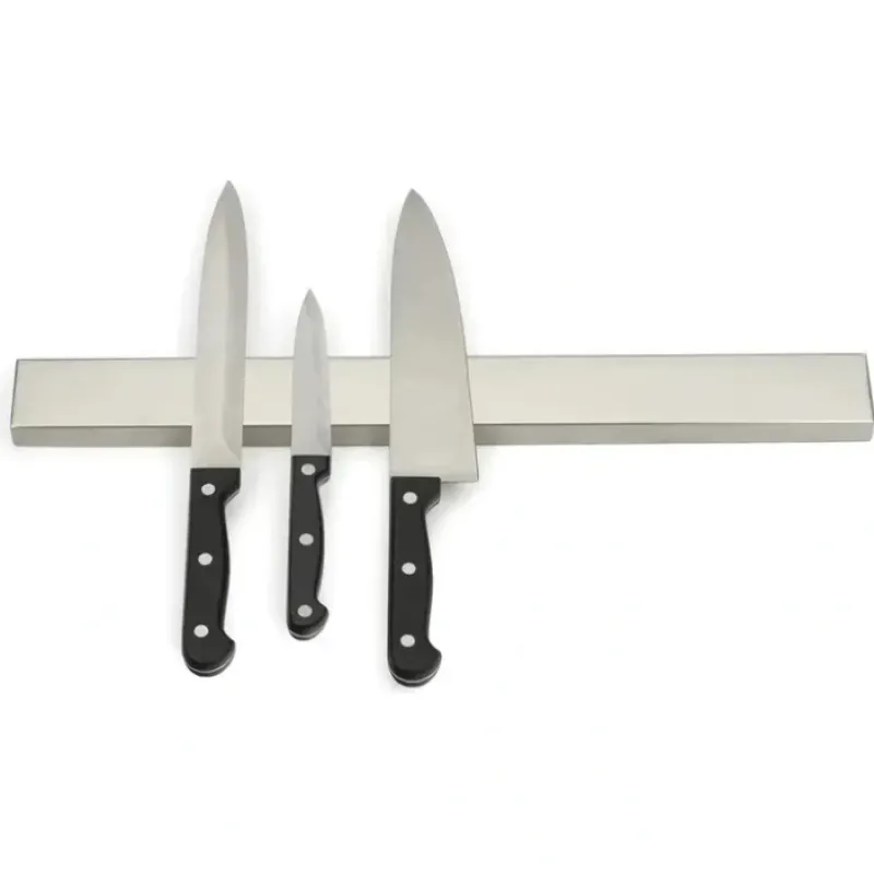 This stainless steel knife holder has a strong. full surface magnet that holds items securely. and the 18/8 stainless steel satin finish complements many kitchen styles.