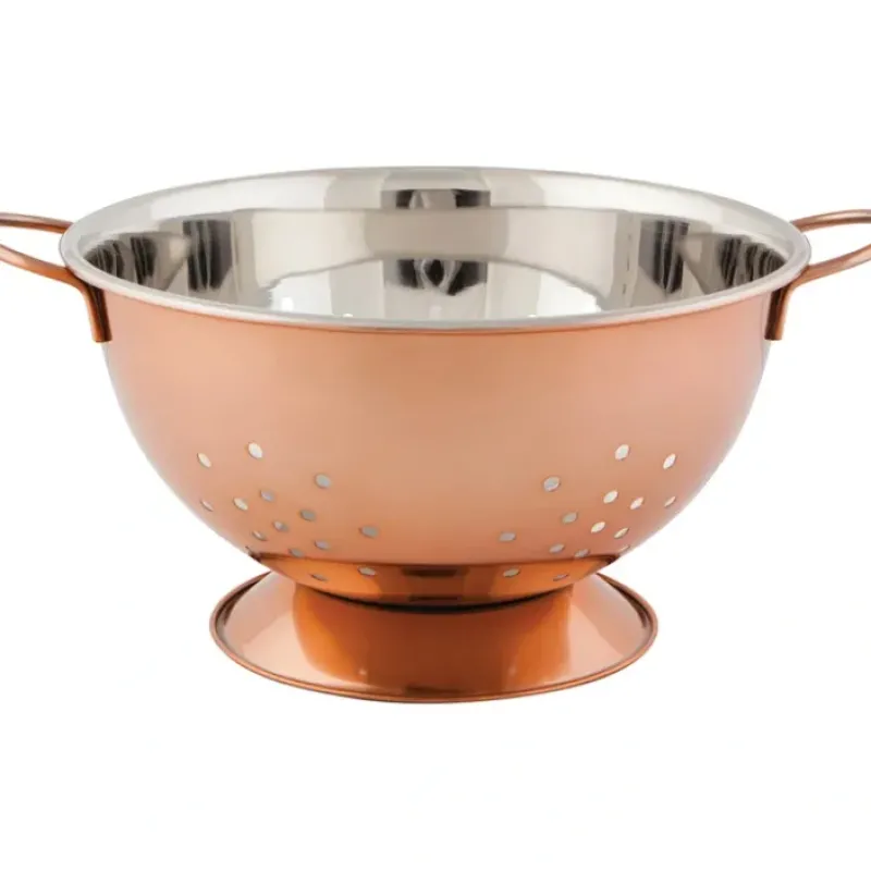 Add the color and charm of yesteryear to your kitchen countertop with this easy-to-grip Large Rose Gold Colander from Now Designs. Made from powder-coated steel. our practical colanders are long-lasting additions to home kitchens. They’re ideal for everyday meal prep tasks such as straining pasta. rinsing fruit and washing salad greens. With an elevated flat base for added stability on countertops. they also make an eye-catching bowl for fresh-picked veggies from the garden.