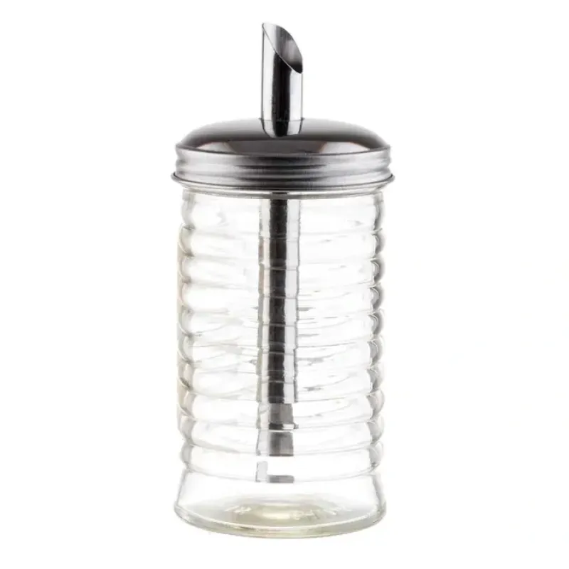 Featuring a retro design. this charming. professional glass sugar pourer creates an inviting presentation for tabletops and coffee stations. It’s sturdy glass construction ensures years of use and durable stainless steel top has a top spout for easy dispensing. Choose from a wide range of shapes. capabilities and dispenser tops to round out any table or buffet setting.Glass (Clear Soda Lime Glass)Height: 6.625″Capacity: 12 ozDishwasher Safe – Metal Tops Hand Wash Only