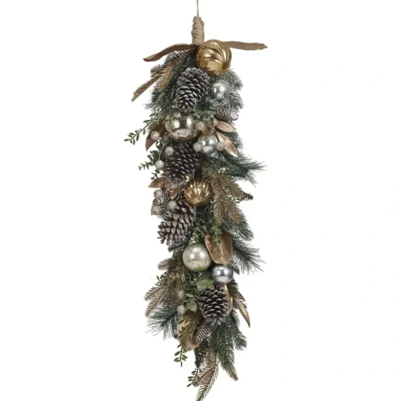 This enchanted forest faux pine swag is a celebration of the holiday season. Its impressive 40 inches of length and 11 inches of height allow it to transform any space into a festive wonderland. A variety of ornaments and pinecones. each dusted with glitter. adorn the swag. catching the light and creating a warm. inviting glow. Crafted from high-quality polyethylene and metal. this swag is a durable and delightful addition to any seasonal decor. bringing joy and elegance year after year. This is a perfect choice for anyone who loves graceful and elegant home decor. A luxurious faux pine swag. adorned with multicolored ornaments. pinecones. and a sprinkle of glitter for a magical touch. This swag brings the wonder of a winter forest into the home. perfect for creating a festive atmosphere. Designed to drape gracefully over mantels or doorways. it’s an essential piece for holiday decorating.
