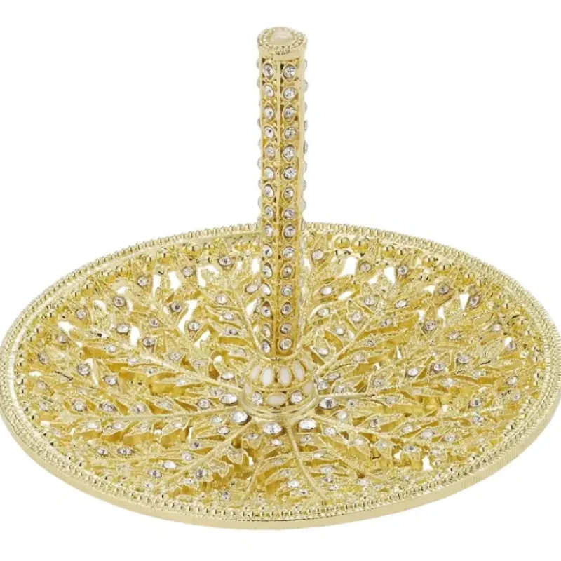 Gold finished pewter acanthus leaf pattern. encrusted with hand-set clear European crystals. Embellished on top with white cat’s eye cabochon. Tarnish resistant. Signature luxury gift box included.