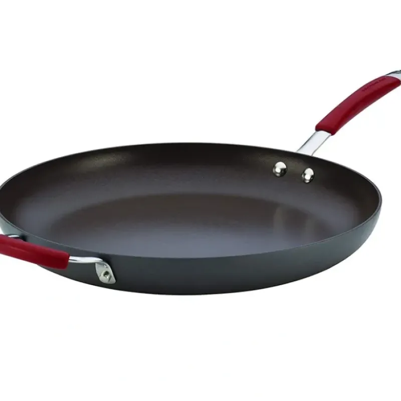 DURABLE FRYING PAN WITH EVEN HEAT DISTRIBUTION: Frying pan features durable hard-anodized aluminum construction that heats quickly and evenlyDISHWASHER SAFE NONSTICK: Fry pan is dishwasher safe for easy cleaning and has long-lasting nonstick interior for effortless food release and cleanupDUAL-RIVETED. GRIPPY HANDLES: The frying pan’s comfortable grippy handles are double-riveted for extra strengthOVEN SAFE: Oven safe to 350°F. this nonstick frying pan is a great complement to many other items in the Rachael Ray collectionsBUILT FOR CONVENIENCE: Large frying pan has a convenient helper handle for moving big portions from stove to oven to tableLIFETIME WARRANTY: Lifetime Limited WarrantyDescriptionCrafted from hard-anodized aluminum. this handsome Rachael Ray Cucina Hard-Anodized Nonstick 14-Inch Skillet with Helper Handle provides fast. even heating. helping to reduce hot spots that can burn foods. It’s the ideal pan for preparing sunny-side-up eggs for family breakfast in the morning and pan-searing marinated pork chops for an evening meal with friends. The appealing espresso-colored nonstick is PFOA-free and long-lasting to provide easy food release and cleanup. Offering a comfortable grasp. the skillet’s rustically-styled silicone-over-stainless-steel handles are dual riveted for added strength and boast an earthy. modern hue for a dash of color – the helper handle aids in moving the pan between kitchen stations. Oven safe to 400 degrees F. the durable pan is suitable for all stovetops. except induction. Dishwasher safe for convenience. this inviting skillet makes an attractive addition to serveware. dinnerware and other cookware pieces in the beautiful Rachael Ray Cucina collection. Day and night. enjoy the rustic. modern style of the professionally crafted Rachael Ray Cucina Hard-Anodized Nonstick 14-Inch Skillet with Helper Handle.