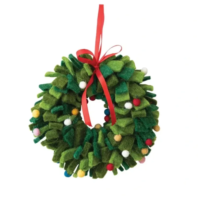 This festive wool felt ornament features a delicately hand-pieced silhouette of a holiday wreath adorned with multicolor pom poms. Ornaments can be showcased as decorations on a Christmas tree. wreath. or atop a festive centerpiece. hung from doorways. displayed on mantels. used to embellish cards and presents. or given as gifts.