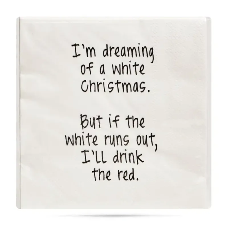 KEYWORDS: I’m dreaming of a white christmas. but if the white runs out I’ll drink the red Cocktail Napkins. wineo. wine lover. winery. vineyard. wine time. hostess gifts. hosting parties. kitchen gifts for entertaining. kitchen accessories. bar decor. entertaining. bff gifts. funny cocktail napkins. girls night. bestie gifts. printed napkins. napkins. funny sayings. snarky gifts. best birthday gifts. gifts for coworkers. disposable napkins. sassy napkins. snarky napkins. holiday entertaining. holiday prep. Our natural kitchen towels are sewn and printed by hand (by our all female team!