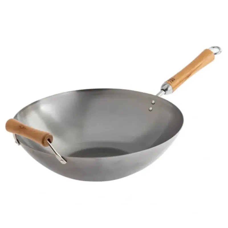 The solid birch wood handle and helper handle provide comfortable grips for easy handling and support when lifting the wok or pouring out food. Upgrade your cooking game with the Classic Series 14-Inch Carbon Steel Flat Bottom Wok with Birch Handles.