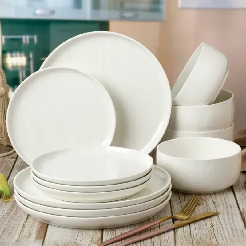 Stoneware with Glaze FinishFour 10.5″ dinner plates. 8″ Dinner plates. 6″ Cereal Bowls Dishwasher. Microwave. Oven SafeScratch ResistantBeautiful 12-piece dinner set packaged in a gift-boxMakes for a unique and sophisticated gift