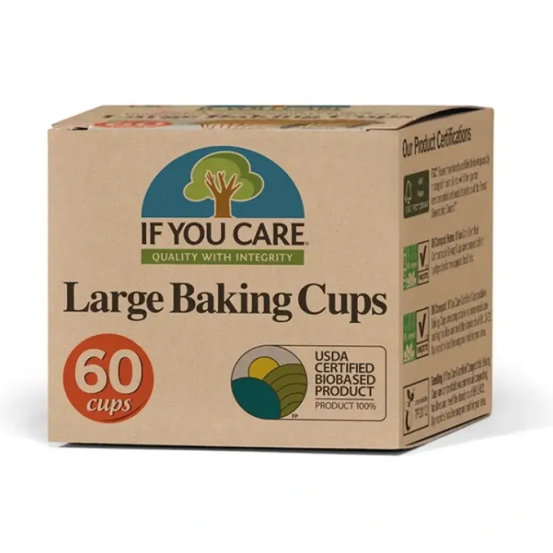 If You Care Baking Cups are made from unbleached totally non-chlorinated grease-proof paper. They are perfect for sweet and savory baked goods. Your muffins. cupcakes. mini quiches and other recipes won’t stick to our baking cups because of their natural easy release properties.Like all If You Care paper products. our Baking Cups are totally non-chlorinated . so no chlorine or chlorine derivatives are dumped into our lakes. rivers and streams.Unbleached. All Natural . Microwave Safe. No Animal Testing. Non GMO. No Vegetarian. Vegan. Non-allergenic.