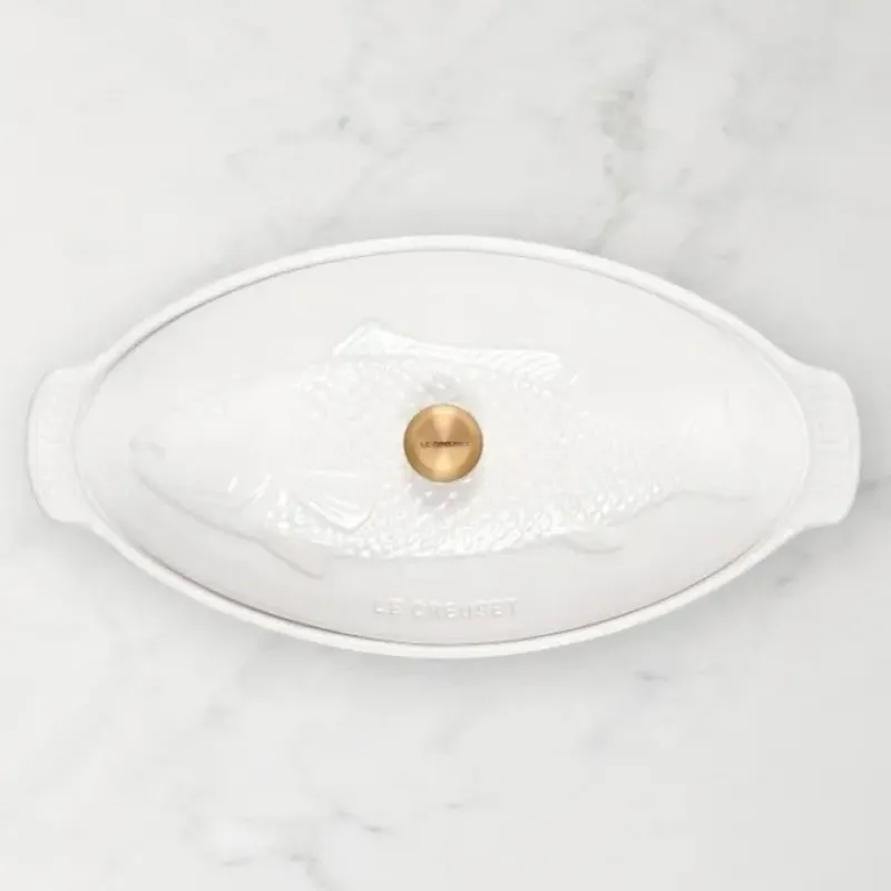 Effortlessly prepare your favorite fish with the Le Creuset 1.7 Qt. Fish Baker. Crafted from high-quality stoneware resistant to stains. scratches. and flavor absorption. this baking dish will make a striking statement when serving meals. The nearly-nonstick ribbed surface offers maximum airflow and uniform searing. resulting in perfectly prepared salmon fillets. tuna steaks. or a whole snapper. Complete with an embossed fish design. stylish brushed gold knob. and a classic Le Creuset Sea Salt glaze. this baking dish will travel from oven to table with ease.