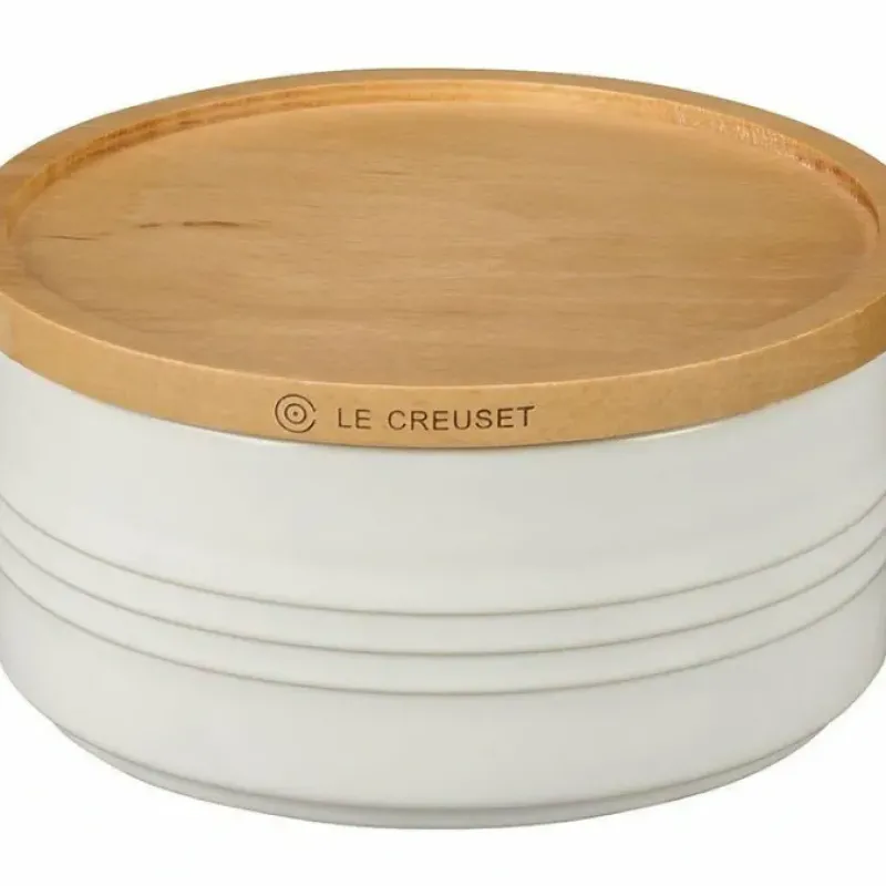 The Le Creuset 23 oz. Canister with Wood Lid in White is part of the all season cookware designed for your active life. Available in beautiful colors that remind you of scenic locations. this white canister keeps fresh things fresh sealed in an airtight silicone gasket. Each color comes in a variety of stackable sizes however every canister size is a stand-alone storage powerhouse. It can sit near your stove. on the sink. in the freezer. or even be used in the oven. But wait. you can warm up leftovers in the microwave. too and then load it in the dishwasher (not the lid). Le Creuset keeps up with your pace of life and guarantees their product with a limited 5-year warranty.
