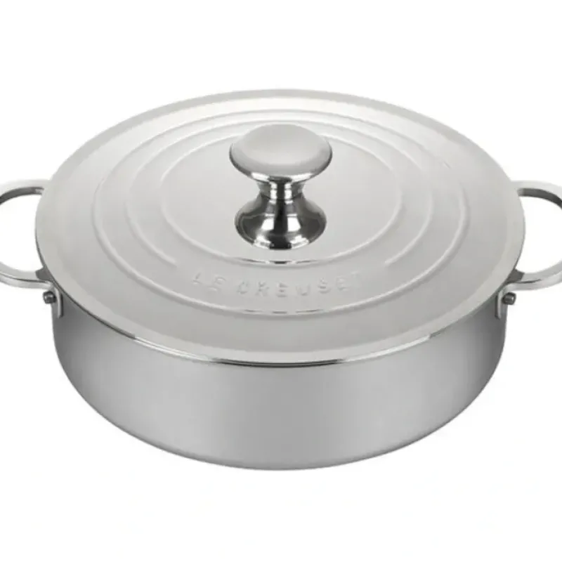 Le Creuset’s 4.5-Quart Tri-Ply Stainless Steel Rondeau is the perfect versatile cooking vessel that can perform almost any cooking task and is a great addition to any chef’s arsenal for making velvety smooth sauces one-pot meals. Similar to a Dutch oven but not quite as deep. a rondeau has straight sides that are deep enough for frying. oven-roasting. slow-cooking. and simmering stews. and a wide. flat cooking surface that’s great for reducing sauces and braising meats to a tender consistency. Le Creuset’s 4.5-Quart Rondeau boasts a triple-layer base-to-rim aluminum core that provides incredible heat distribution across the surface for even and thorough cooking. Finished with a stunning lightweight mirror-polish titanium-infused stainless steel exterior. this durable rondeau exudes radiance while resisting discoloration at high temperatures. ensuring it remains beautiful after years of use.