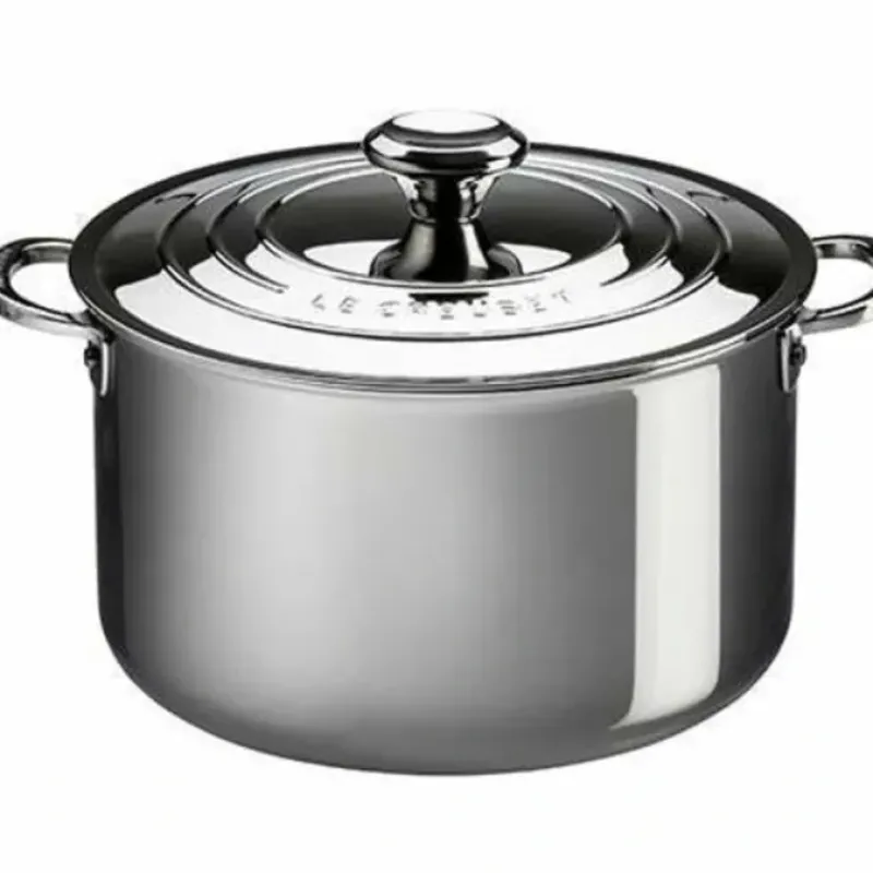 Le Creuset puts their signature on this professional-quality. triple-layer cookware. an expression of their passion for quality and engineering excellence. Premium stainless steel with a beautiful luster sandwiches a “total” aluminum core—from the base all the way up to the drip-free. precision pour rims—for even heat throughout. A special magnetic steel makes it perfect for all cooktops. including induction. Thoughtful design details include laser-etched interior capacity markings and double-riveted. ergonomic stainless handles. making lifting safe and convenient. Tight-fitting lid with the signature triple ring design. oven-safe knob and stable. flat rim locks in flavor and moisture. An internal self-sealing flange locks in moisture and flavor. while a relief vent helps release excess pressure and steam to prevent boiling over. All pieces are versatile enough to go from the stovetop to the oven. This size stock pot is ideal for boiling vegetables or pasta. corn and lobsters. simmering soup. or creating a flavorful stock.