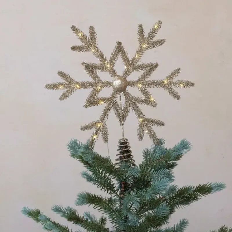 This dazzling champagne snowflake tree topper is sure to add a touch of magic to the holiday décor. Measuring 14 inches in length. 2.25 inches in width. and 15 inches in height. it features a beautiful snowflake design embellished with sparkling glitter in a glamorous champagne color. Pre-lit with warm LED lights. this tree topper creates a magical glow atop the Christmas tree. Made of a durable combination of plastic and metal. this festive decoration is built to last throughout the holiday season. Please note that 2 AA batteries are required for operation (not included). A festive 14-inch LED snowflake tree topper adorned with sparkling glitter in a glamorous champagne color. Ideal for creating a magical Christmas atmosphere atop the tree. Lights up the holiday décor with its warm. glowing LED lights.