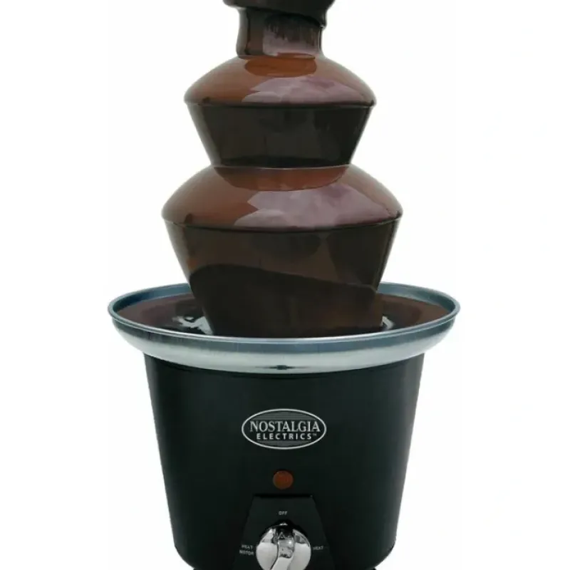 This miniature fountain will fit on any kitchen or dining table. making it ideal for special occasions or everyday use. It creates a cascade of sweetness that will add mouth-watering fun to any gathering. Use a variety of chocolates and serve friends and family delicious snacks. appetizers and desserts. The Mini Chocolate Fondue Fountain works great with Milk Chocolate.Dark Semi-Sweet Chocolate. White Chocolate. Butterscotch Dip strawberries. marshmallows. apple wedges. pretzels. cookies. ice cream balls. chilled peanut butter balls and more in the flowing chocolate. You may also add liqueurs for sophisticated flavors. Use your imagination and have fun!Stainless Steel BowlElegant black base and stainless steel heated bowl keeps the chocolate flowing. adding the perfect touch of class and elegance to any event.Auger-Style FountainAuger style fountain with 3 easy-to-assemble. heat resistant. cascading tiers. The base heats with a simple turn dial that keeps the chocolate at the perfect temperature.The Options Are EndlessThe fountain creates a cascade of sweetness that will add mouthwatering fun to any gathering. Use a variety of chocolates. liqueurs. cheeses. and BBQ sauces to serve friends and family delicious snacks. appetizers and desserts.2-tier plastic chocolate fondue fountainAuger-style carries melted chocolate from the base to the top of its towerDip fruit. marshmallows or pretzels into flowing chocolateIdeal for parties