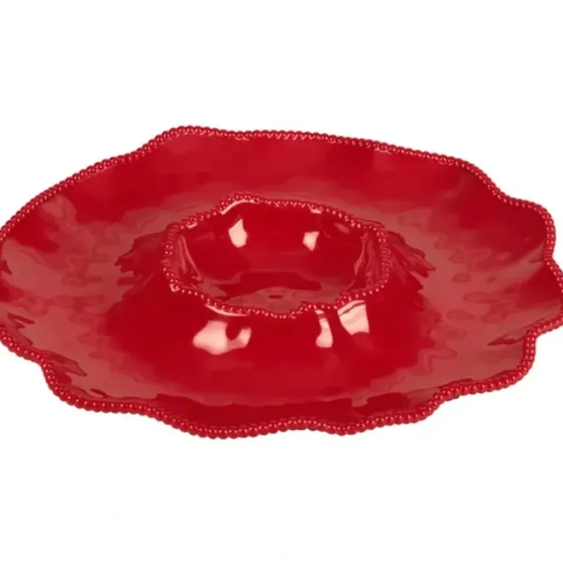Welcome a burst of festive elegance to your gatherings with the Perlette Red Melamine Chip and Dip tray. This 14.5-inch tray. with its radiant red hue and ornate scalloped edges. is a celebration of both style and functionality. Designed to be the centerpiece of any party table. it perfectly cradles your favorite chips around the outer edge. while the central well awaits a delicious dip. Made from the finest melamine. it mimics the glossy sheen of ceramic without the risk of shattering. making it ideal for both indoor festivities and outdoor soirees. After the party winds down. the tray’s dishwasher-safe feature ensures a quick and easy cleanup process. allowing you to end your night on a high note.