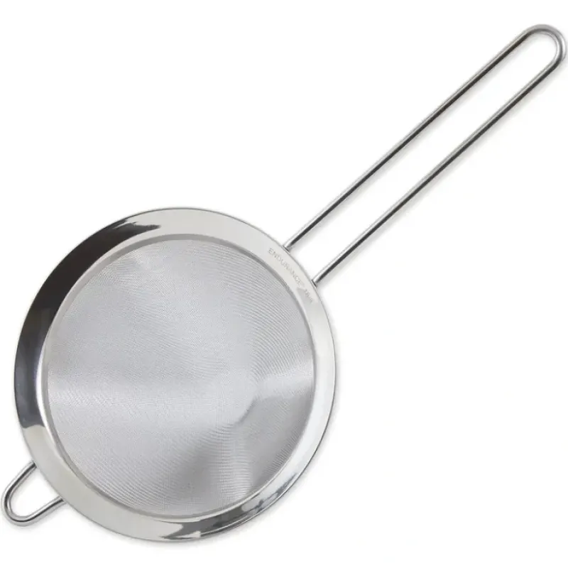 - Extra fine mesh cone shaped strainer with polished rim and handle.