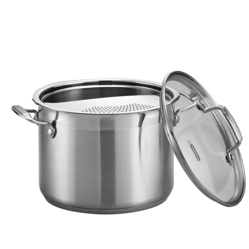 Take the clumsy awkwardness out of draining hot pasta. Tramontina”s Gourmet 18/10 stainless steel 3 Pc 6 Qt Pasta Cooker makes draining large quantities of pasta. steamed veggies. even seafood and stocks. a breeze. The set includes: one 6 Qt pasta cooker; one tempered glass lid. and one locking strainer. each constructed in a magnetic three-ply base compatible with all cooktops. including induction and ceramic glass. Double-riveted. stainless steel handles stay cool and offer a comfortable grip. The set is dishwasher-safe. and oven-safe up to 500°F / 260°C without the glass lid and up to 350°F / 176°C with the lid. An excellent investment for professional chefs and cooking enthusiasts!
