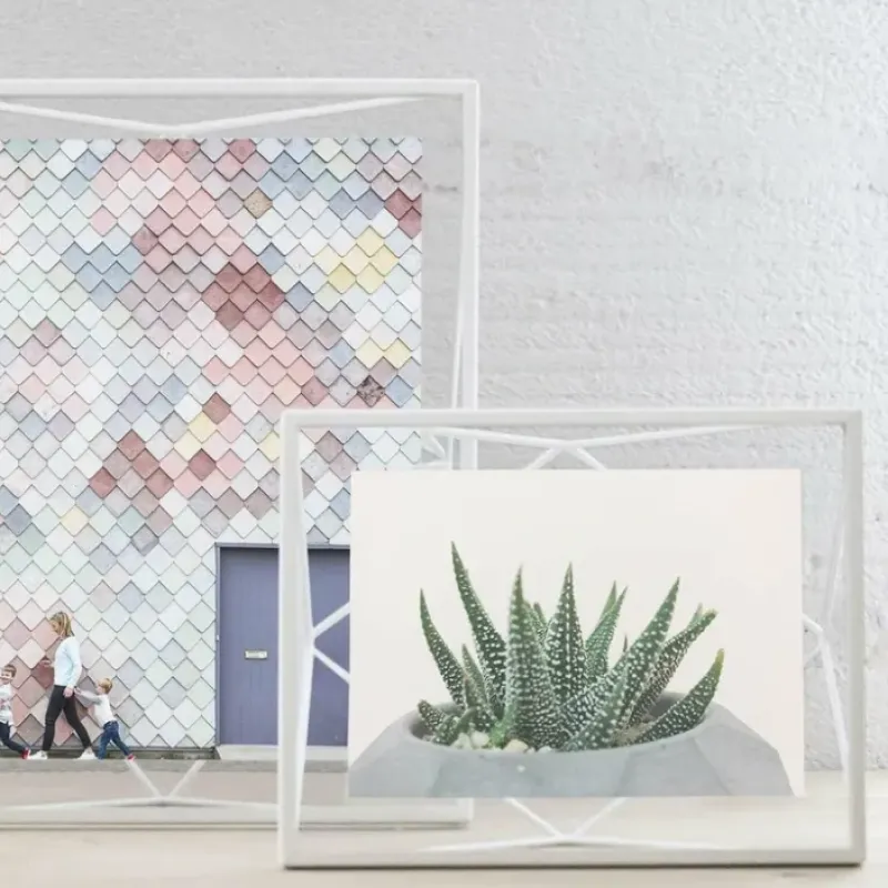 Add new dimension to your photo displays with this prismatic. 8 in. x 10 in. wire frame. the elegant and contemporary Prisma photo display frame by Umbra. in which a photo floats between 2-panes of glass. Prisma can sit vertically or horizontally and can be mounted to the wall or used as table decor. Wire shapes show through the front of the frame as your photo sits between 2-panes of glass. Each frame comes in an elegant gift box making it great to give away. Measures 10 in. x 12 in. x 3 in. Designed by Sung Wook Park for Umbra – original. modern. casual. functional and affordable design for the home.